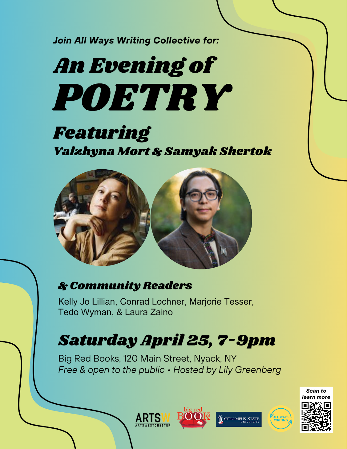 Join All Ways Writing and Big Red Books for an evening of poetry featuring renowned poets Valzhyna Mort and Samyak Shertok joined by community readers Kelly Jo Lillian, Conrad Lochner, Marjorie Tesser, Tedo Wyman, and Laura Zaino.