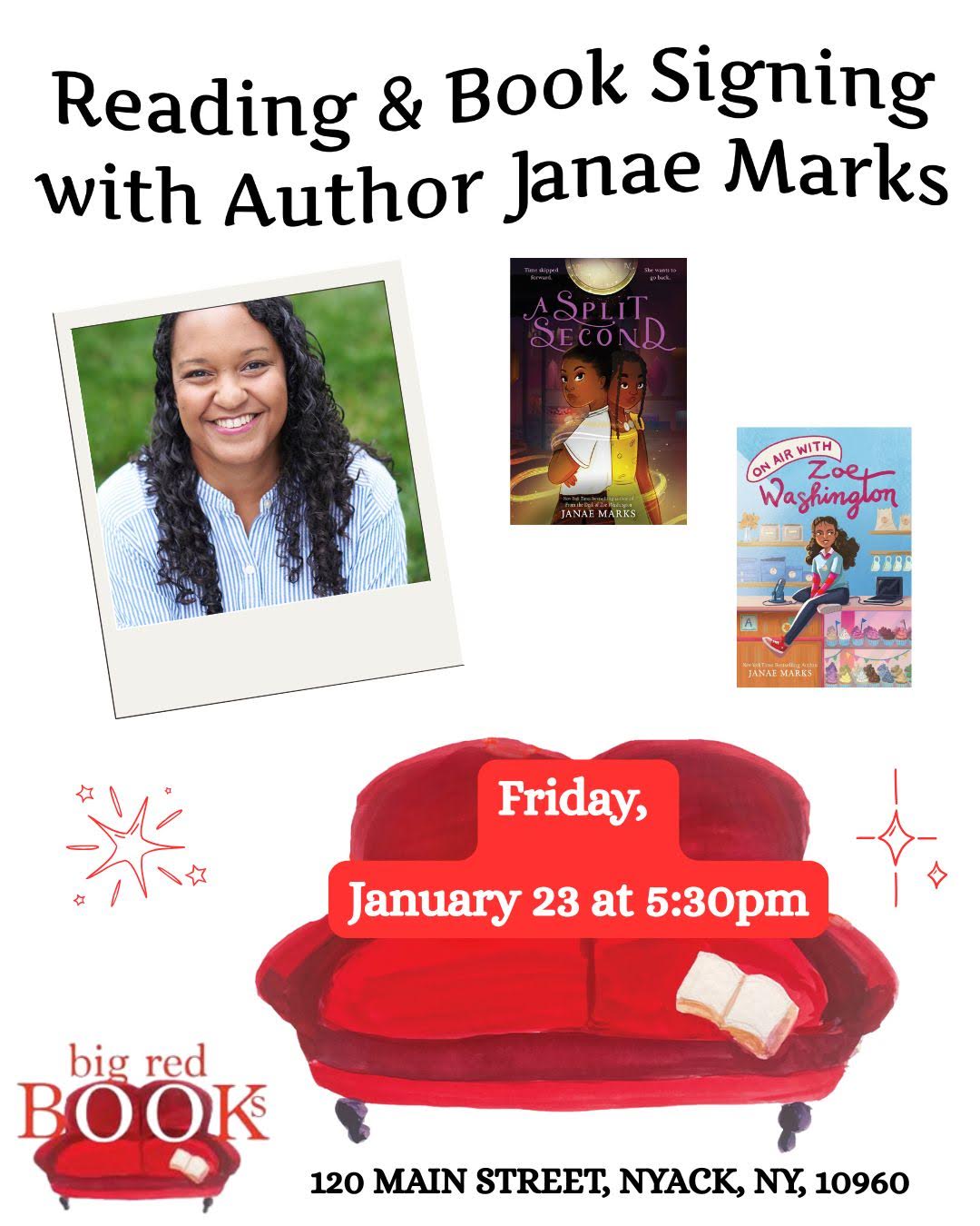 Janae Marks is the New York Times bestselling author of the Zoe Washington series, A Soft Place to Land, and A Split Second. Her work can also be found in the middle grade anthologies Hope Wins, edited by Rose Brock, and Black Girl Power, edited by Leah Johnson. Her novels have been named Best Book of the Year by Parents Magazine, Chicago Public Library, the Boston Globe, the Bank Street College of Education, and others.